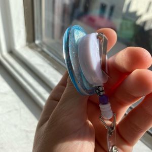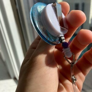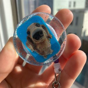 Handmade badge clip with a golden retriever dog face zoomed in with blue glitter.