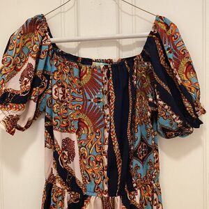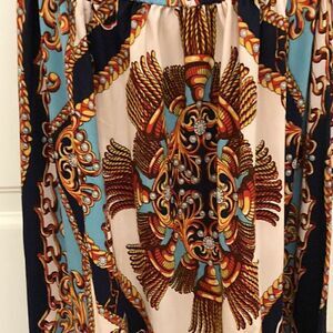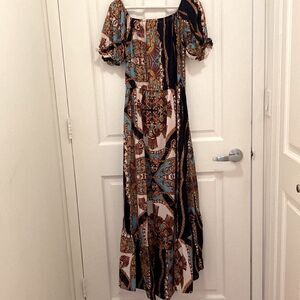 Golden Sirena maxi dress, short sleeve with elastic ruffle edge, elasticized waist and high low ruffled hem. Can be worn on or off the shoulder. Dolce & Gabana inspired print.