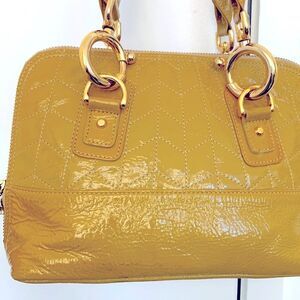 TAGS: goldenbleu handbag, yellow patent leather purse, designer yellow satchel, structured leather bag, contemporary shoulder bag, goldenbleu parker purse, handbag