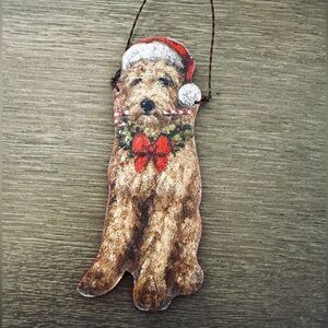 NWT rustic wooden goldendoodle dog shaped Christmas holiday ornament with wire metal hanger.