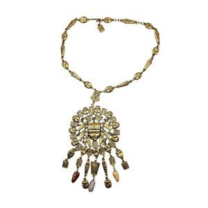 This exquisite Goldette necklace, inspired by ancient Egyptian design, is a striking representation of 1970s fashion. Elaborate details like scarabs and cartouches complement its gold tone, and the ornate pendant captures Egyptian aesthetics. A captivating piece that embodies the allure of vintage jewelry, it offers a timeless touch of elegance.