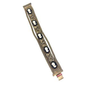 This exquisite vintage gold-tone cameo bracelet features a delicate mesh band adorned with intricate oval cameos, each depicting classical profiles reminiscent of Victorian-era elegance. The ornate scrollwork and timeless design make it a distinguished piece that adds a touch of history and sophistication to any collection. Embrace the charm of the past with this unique accessory.