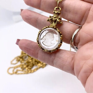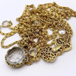 Goldette Vintage Triple Strand Intaglio Cameo Gold Necklace. Measures approximately 26”, 31”, 34”. Very nice vintage condition. Lovely!