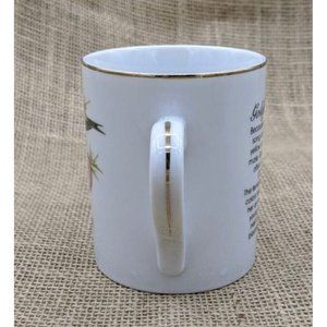 This is a John James Audubon Porcelain Mug with Goldfinches. The mug has a male and female goldfinch with purple thistles on the front. The back has a description of the goldfinch.
