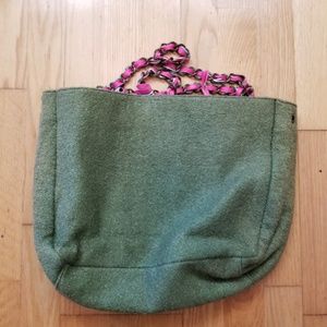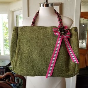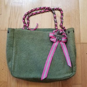 New, satin lined tote style shoulder bag. This has a ribbon braided chain handle with attached rosette. The shell has a sort of tweedy texture in a grass green. Great size and has a zippered interior pocket as well.