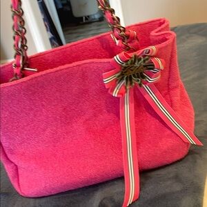 This vibrant pink shoulder bag from Goldie is crafted with a luxurious wool-like texture, featuring elegant chain-link handles that add a touch of glamour. The standout decorative embellishment on the front makes it a unique accessory, perfect for elevating any ensemble.