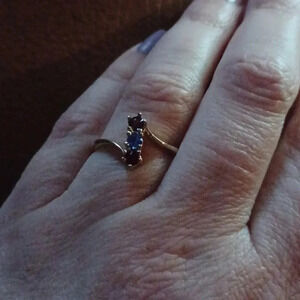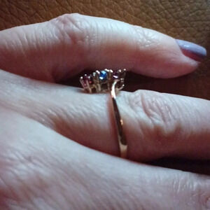 The mother’s ring in the picture is a gold-plated band with three faux gemstones.