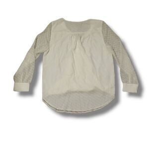 Brand new from Stitch Fix. Beautiful V Neck Blouse with see through polka dot raised material sleeves. The dots continue down the back and it has added length while it is gatheredand flowy in the front. This blouse is a great addition to a business casual closet and will yield you many compliments.