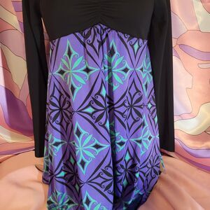 The listing is for the new with tags Japan import discontinued Golds Infinity long sleeve dress. There are black flared sleeves, lace details at the collar, and a unique purple and aqua diamond print skirt.