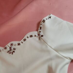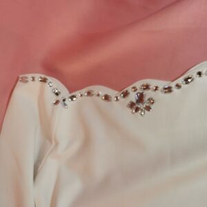 New with tags white Golds Infinity Japan import dress, Flat bust and waist measurements shown in photo. Golds Infinity discontinued white Rose print dress with rhinestone details along top shipped with care.