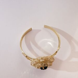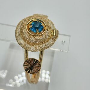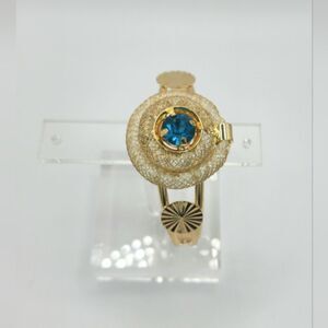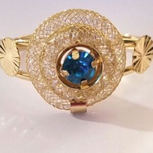 Gold tone cuff bracelet with diamond like floating stones inside and around a large bright blue gemstone!