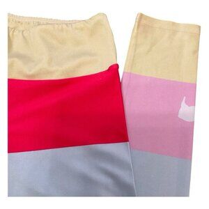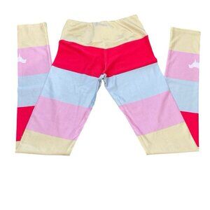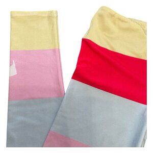 Vibrant leggings with bold stripes. Features red, pink, blue, and cream colors. Perfect for a stylish workout.