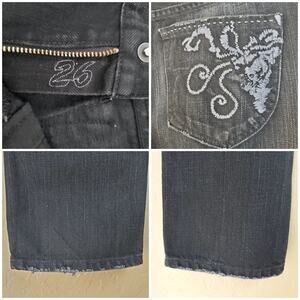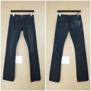Goldsign Envy low rise black denim jeans, size 26. Straight leg. Pants zip and have a slide button fly closure.