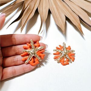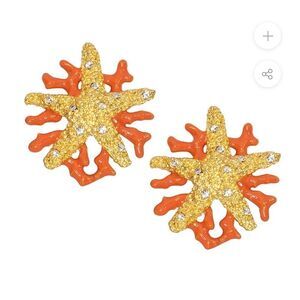 Crystal statement starfish surrounded by coral enamel branches earrings in gold tone