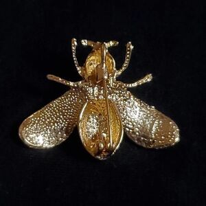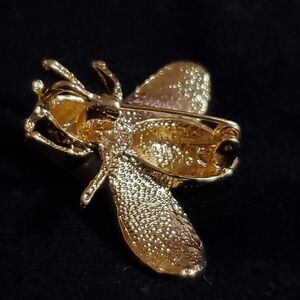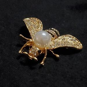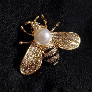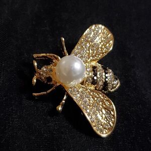 Goldtone bee brooch features clear and black crystals along with a larger pearl in the middle. Sparkly and elegant, will lend just the right amount of flair to your hat, scarf, lapel or bag. Perfect gift for anyone, but especially those who love or advocate for bees. Features a C clasp closure and has a loop you can thread a chain/ribbon through to wear as a pendant.