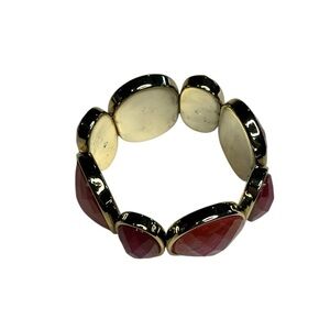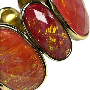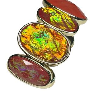 This listing is for a stunning goldtone stretch bracelet featuring faux fire red and green dichroic faceted stones. The large stones are vibrant and multi-dimensional, creating a dazzling play of color that catches the light beautifully.