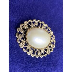 Goldtone Filigree Brooch Pin Oval Faux Pearl