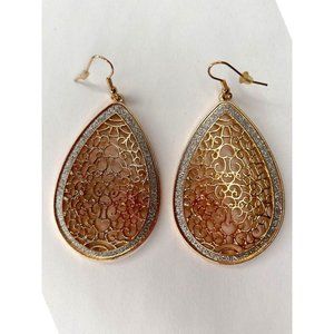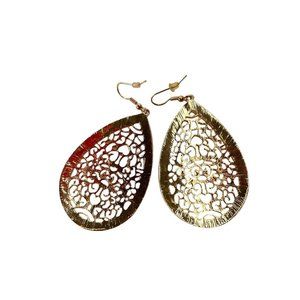 Goldtone Filigree Cutout Earrings Teardrop Shape Pierced Hook 2.25" Drop Dangle