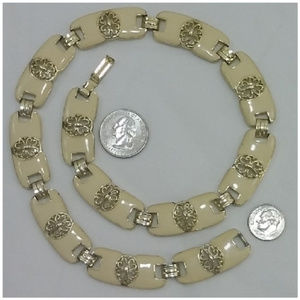 Fun costume jewelry! Goldtone Filigree and Enamel Hinged Necklace. Bar Hook clasp. Coin for sizing comparison, Not included with jewelry. SAVE BIG! AUTOMATIC 30% BUNDLE DISCOUNT! ADD TO A BUNDLE!