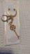 Elegant gold keychain with a key design. Features multicolor gemstones. Perfect accessory for bags or keys.