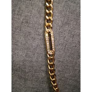 The necklace features a gold-plated chain with long ovals embedded with small white crystals that add a touch of sparkle.