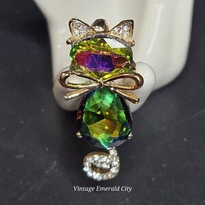 This gorgeous goldtone cat brooch is a dazzling addition to any jewelry collection! Featuring an iridescent rhinestone tail and ears, plus a crystal-encrusted bow, this feline friend sparkles with charm and elegance. Perfect for cat lovers, brooch collectors, or anyone who loves a touch of whimsy in their accessories.