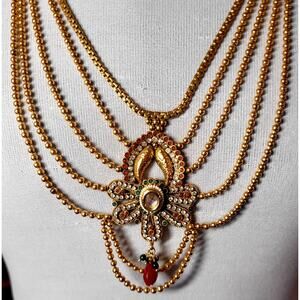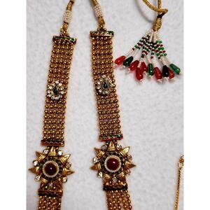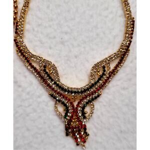 Goldtone Red Green Rhinestones India Wedding Ethnic Necklace Lot Bollywood Festoon Choker Glam Boho. The long festoon necklace has a few goldtone beads that have some metal wear off or discoloration.