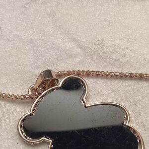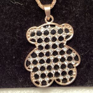 Goldtone chain is 28” in length and has a lobster claw clasp. The teddy bear pendant adds another 2 1/2” in length and is 1 1/2” wide at its widest point. The metal grid over the black acrylic background of the bead is highlighted with clear crystals throughout. Large bale on pendant allows for its removal if you wanted to just war the chain or add your own pendant.l