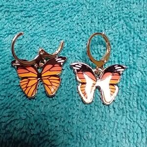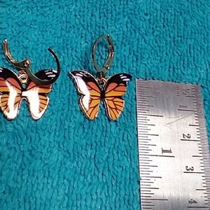 Goldtone black orange yellow butterfly pierced dangle wire earrings