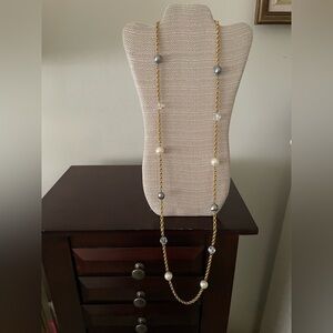 Necklace is 22 inches long and can be doubled or tripled. Very classic look goes with any outfit.