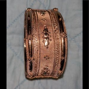 This gold toned handmade in India bracelet cuff with hinged closure is a stand alone piece of jewelry. Metalwork all the way around on a mesh foundation.
