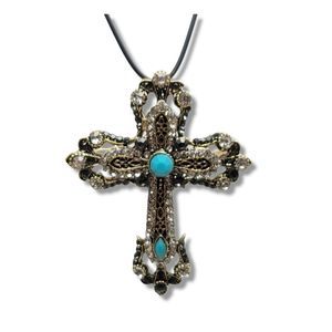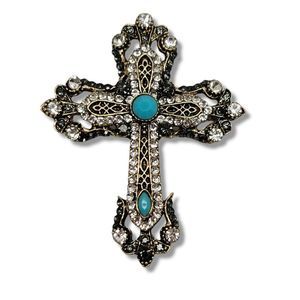 Gold-tone multicolor Crystal with Turquoise color accent beading Cross Brooch Pendant