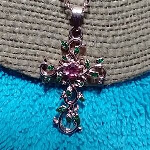 Goldtone pink stone green leaves scroll Christian Catholic cross chain necklace