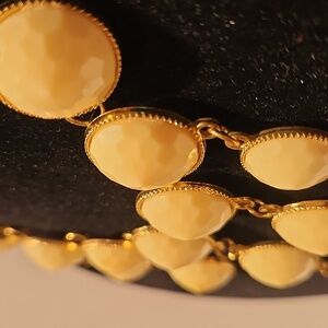 This stunning necklace features elegant cream accents set in a luxurious gold chain. Does have some wear on the loater claw closure. Also, could use a good cleaning.