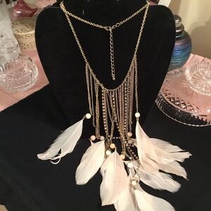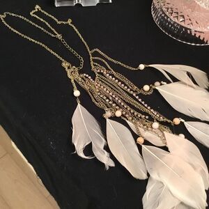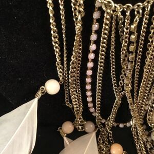 Adjustable necklace features 24” inside diameter goldtone chain can be adjust to 26 1/2”. Lobster claw clasp. Multi strands form the “pendant” of white feathers, whit and blush acrylic round beads, chains and tiny white acrylic crystals. This adds another 10” to the overall length of the necklace. $10 each or bundle 3 of same price for $20 to save.