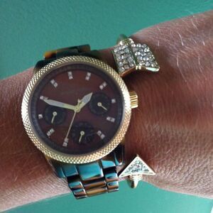 Simple, gold tone open cuff with a delicate band. Arrow tip and tail have beautiful sparkling rhinestones. Adjustable.