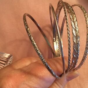 Three patterned bangle bracelets in goldtone finish. They have an inside diameter of 2 3/4”, so it should fit up to 8 1/2” inch size. Very gently used as shown in photos.