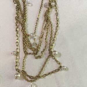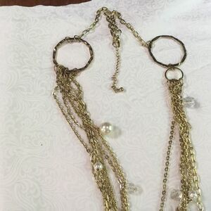 This goldtone lacy chain necklace has an extender to add to it’s length. It can be worn from 26” to 28 1/4” length and features a lobster claw clasp. 6 Layers of chains hang from the gold tone hammered circles and hold two sizes of faux white pearls and two sizes of clear crystals. Just Beautiful. $12 each or bundle 3 pieces of jewelry of same price for $25 and save.