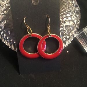 Goldtone fish hook backs on these red enamel with goldtone trim earrings. Overall drop of 2”. $8 or bundle 3 of same price for $15 and save.