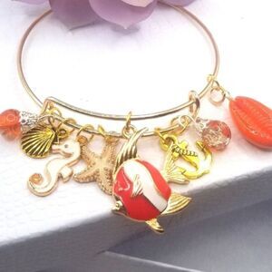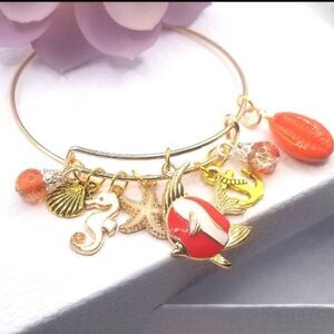 gold toned bangle cuff Adustible charm bracelet hand made. gold toned sea animals / ocean inspired. fish charm, also has a Orange cowrie shell .