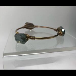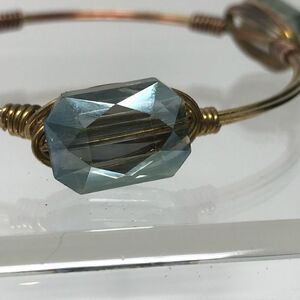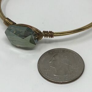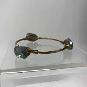 Really nice gold tone wire wrap bracelet in good used condition. The blue stones are eye catching.