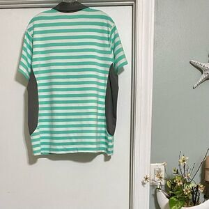 This must-have green and white horizontal striped polo shirt has silver accents, Short sleeves, five button placket and gray side vents with a matching gray collar. It is in excellent gently used condition with no stains, snags or flaws to mention. It is made of 95% polyester and 5% spandex. Machine wash cold and tumble dry low. Additional button is still attached to the inside wear label tag. It is an XXL with American comfort and style. Approximate measurements lying flat are armpit to armpit: 23” length from shoulder to hem: 27”.