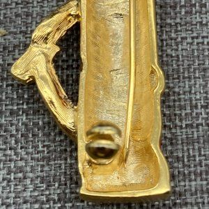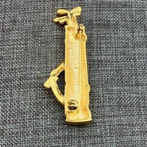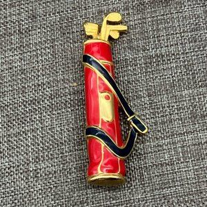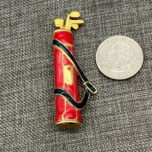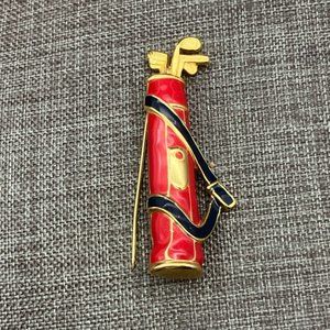 Retro vintage style golf bag pin brooch, goldtone with red and black enamel! Latch is missing on closure on back, as shown, sold as is, still wearable with care.