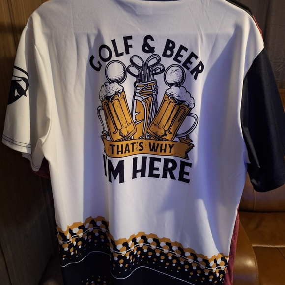 Fun graphic t-shirt with 'Golf & Beer' design. Features beer mugs and golf clubs. Perfect for casual outings.