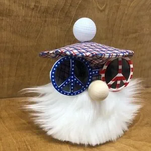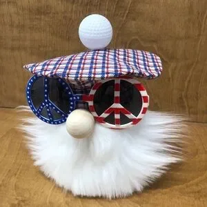 Red, white and blue plaid tam with golf ball and Stars and Stripes sunglasses. Peace symbol.