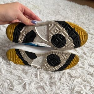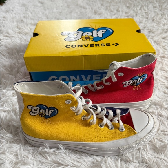 Converse by Golf Wang, red yellow and blue with smiley face feature on bottoms. Unisex, size 6.5 men’s and 8.5 women’s. Rare find!