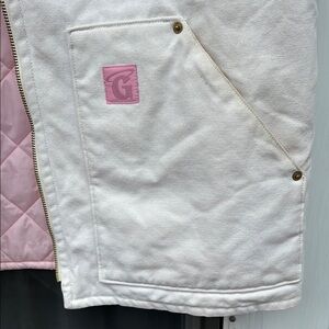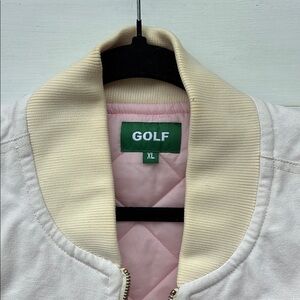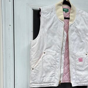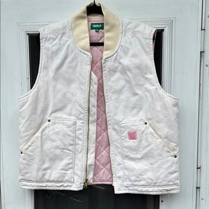 Cream vest with pink quilted lining. Features Golf Wang logo.