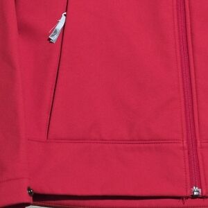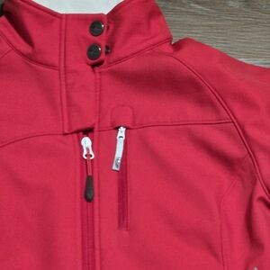 In pre-owned condition, Small stain at inner fleece, Full zip Closure, Snap button collar, Zip pockets, Fleece lined, Snap button cuffs, Vibrant red jacket by Golite. Features a sleek design with button details. Golite Trinity Fleece Red Outdoor Active Winter Jacket, Size M.