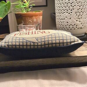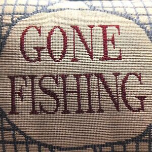 Gone Fishing Small Tapestry Accent Pillow in blue, tan, and red. This accent pillow features a windowpane check background, outlined fish in the middle, red lettering, solid blue back, and solid blue piping trim.
