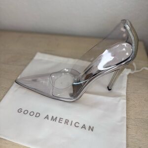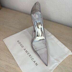 Be the belle of the ball with these stunning Good American Cinderella pumps. With a clear, ultra high stiletto heel measuring at least 4 inches, these shoes are perfect for going out, weddings, clubwear, and celebrity events. The pointed toe shape and rubber upper material add to the sleek and chic design of these pumps